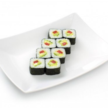 Нори, рис с соусом Мицукан, томат свежий, огурец свежий, сливочный сыр, салат «Айсберг»
